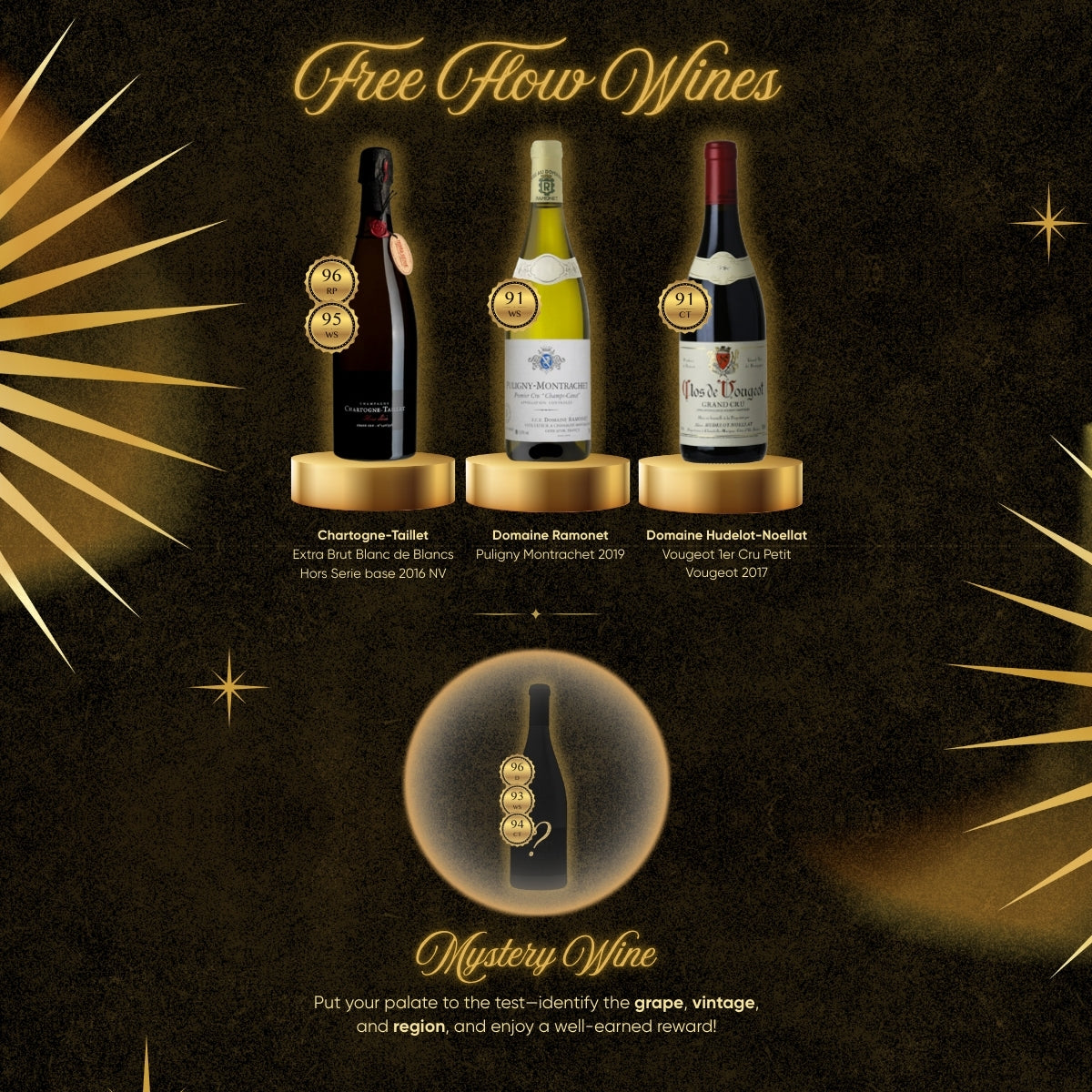 Step into an evening of free-flow wines, where order is optional and curiosity is encouraged - including one mystery bottle waiting to be uncovered. indicate the grape, vintage, and region for your guesses: get all three right for the same wine, and a special reward awaits. Unhurried, refined, and designed for those who appreciate a graceful ending.