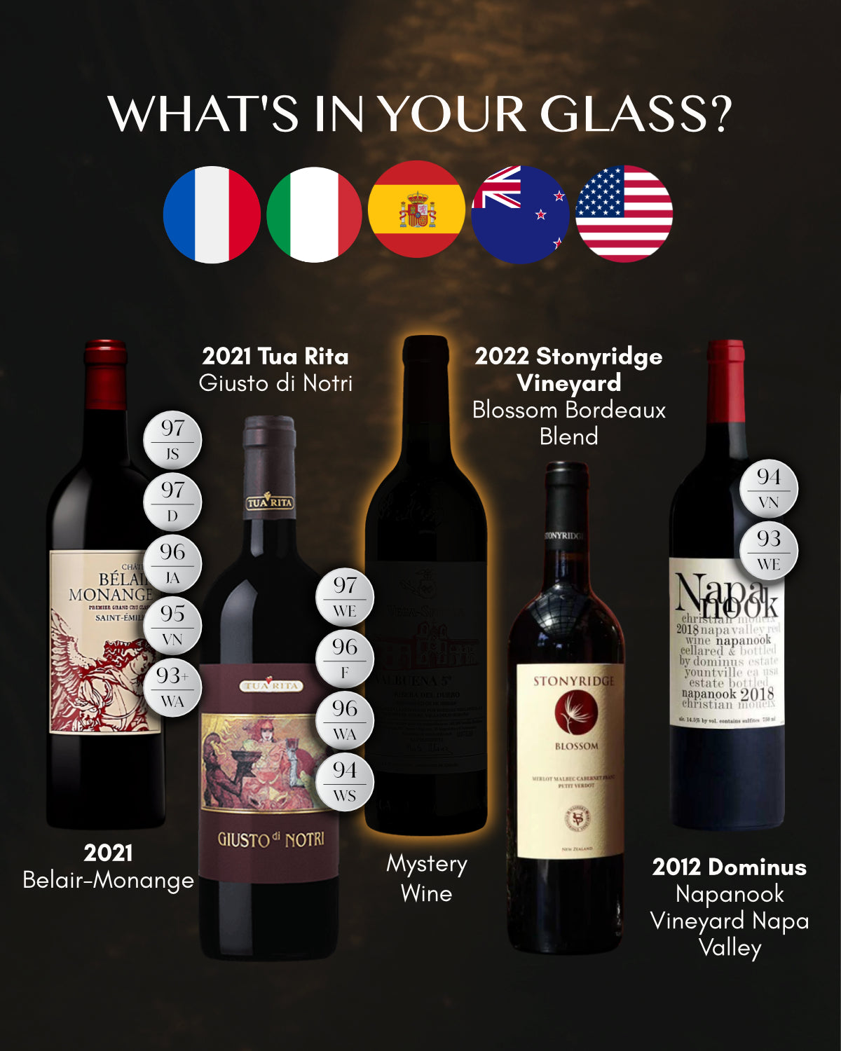 One of the wines will be presented as a Mystery Wine, revealed only during the tasting.