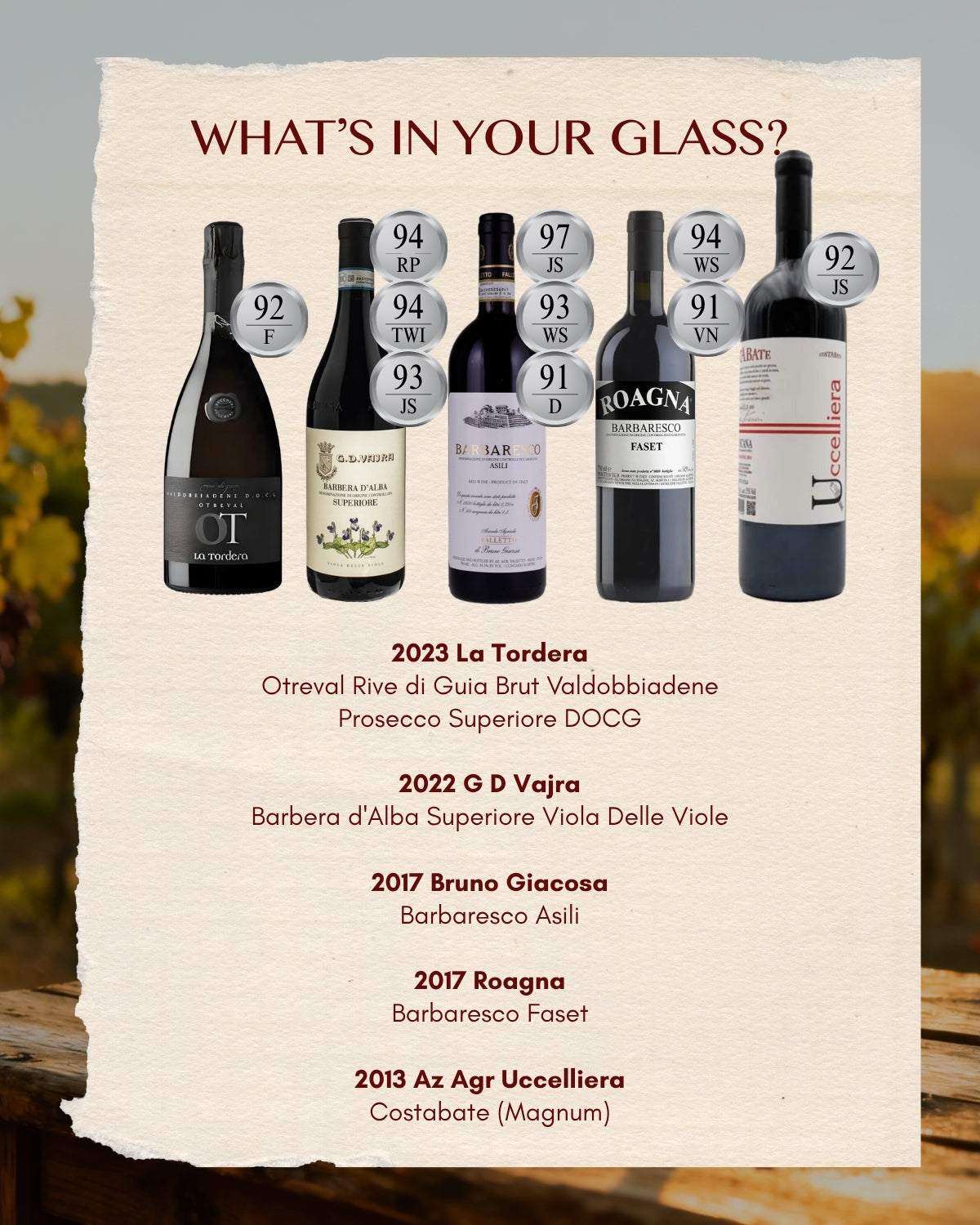 Join us for a guided masterclass exploring the depth and character of Italian reds, featuring a curated selection that highlights the elegance of Barbera and the complexity of Barbaresco, alongside a special aged expression served in magnum.